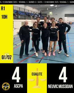On commence contre Neuvic avec le DH qui parvient à trouver des solutions qu’à la fin du 2eme set, un peu trop tard.. Le DD s’en sort beaucoup mieux en 2 sets. Les SH suivent. Thibaud en SH1 s’accorche mais s’incline en 2 sets. Nicolas quant à lui, trouve des solutions, et gagne en 2 sets. Les SD commencent. Lucie presque trop tranquille remporte le premier set 22/20 puis écrase son adversaire 21/06. Florence s’en sort tout aussi bien en 2 sets avec de la marge. Les 2 mixtes sont gagnés en 2 sets 21/14. Victoire 6/2